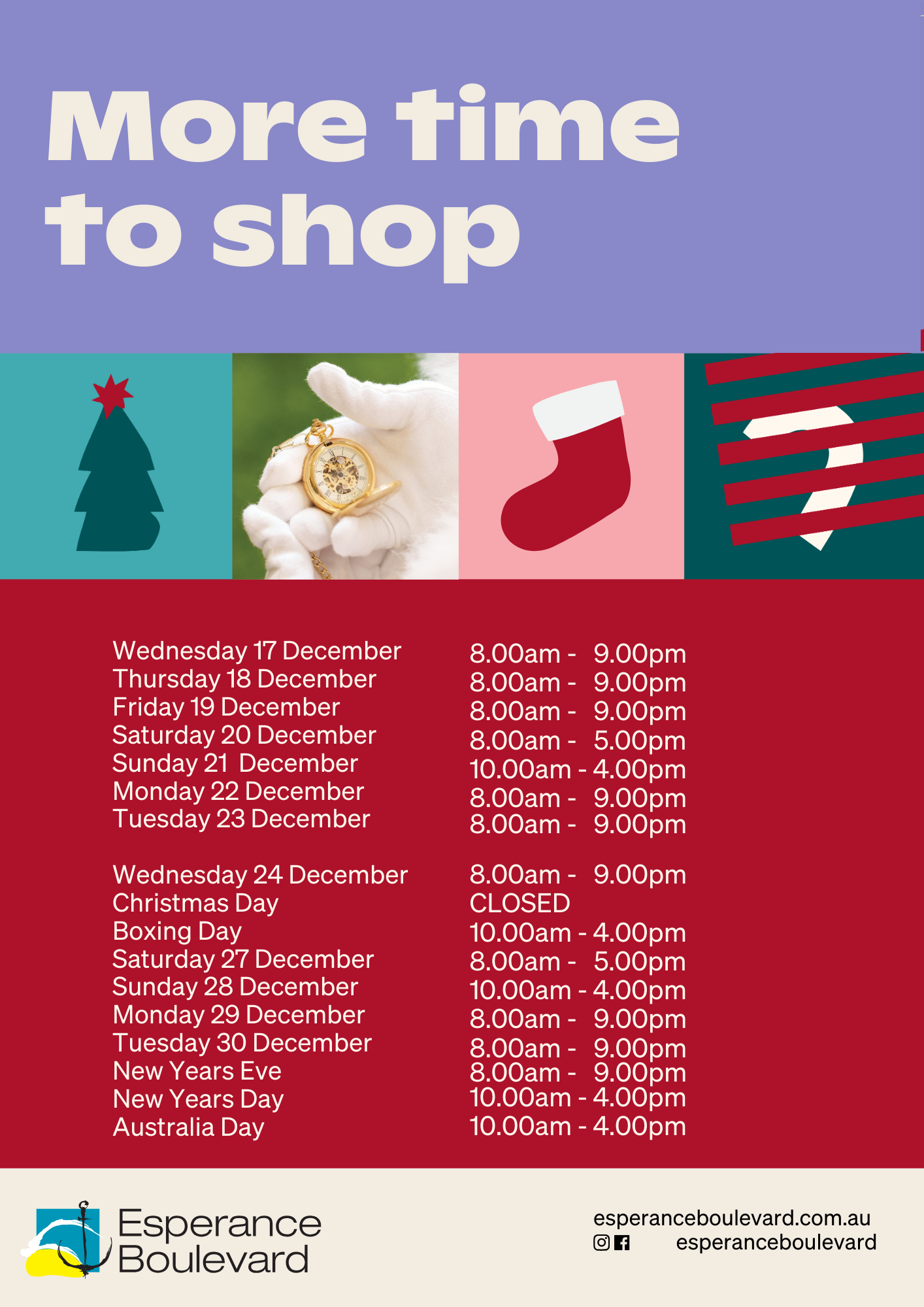 This festive season, we’re giving you the gift of time. With extended trading hours at Esperance Boulevard, you can shop at your own pace.